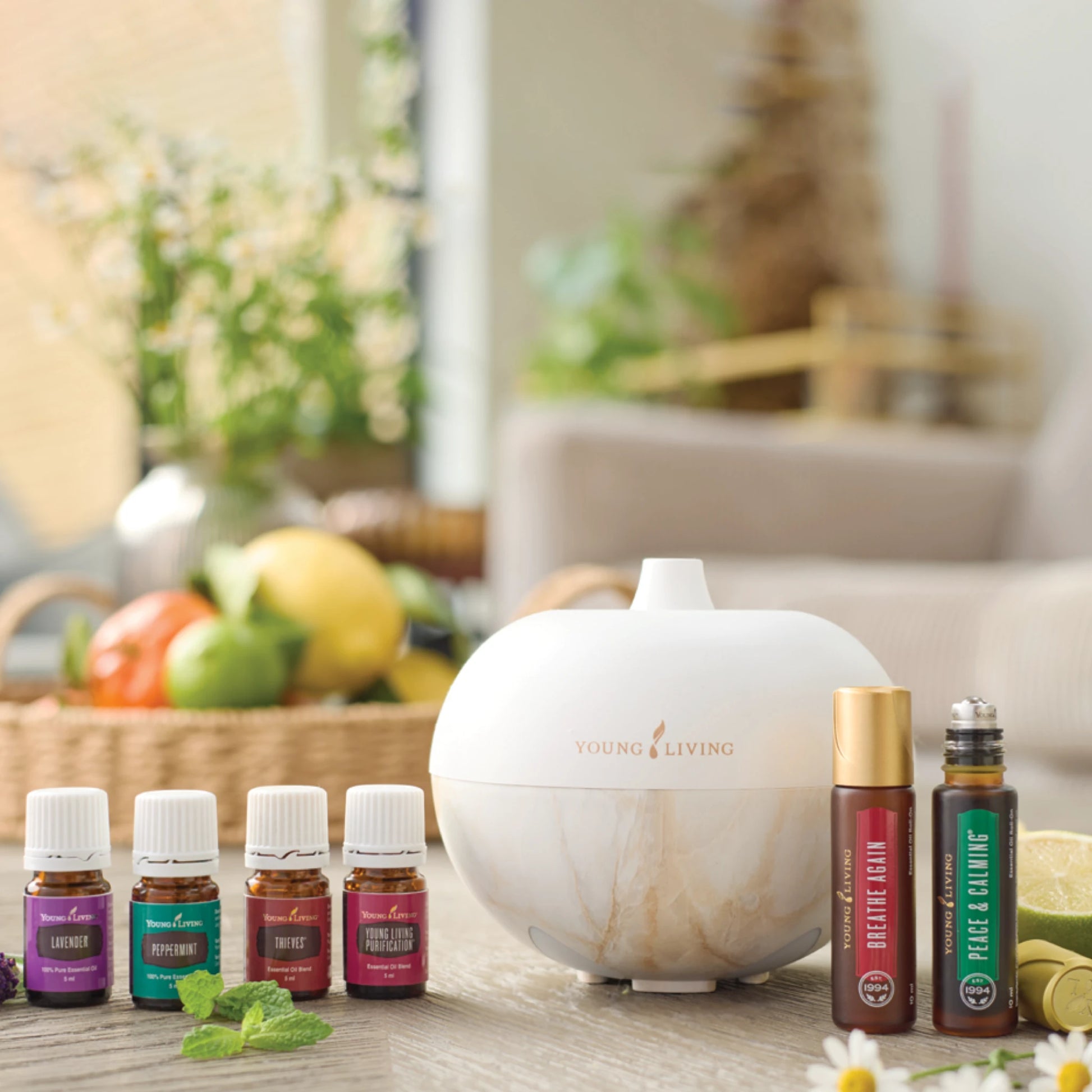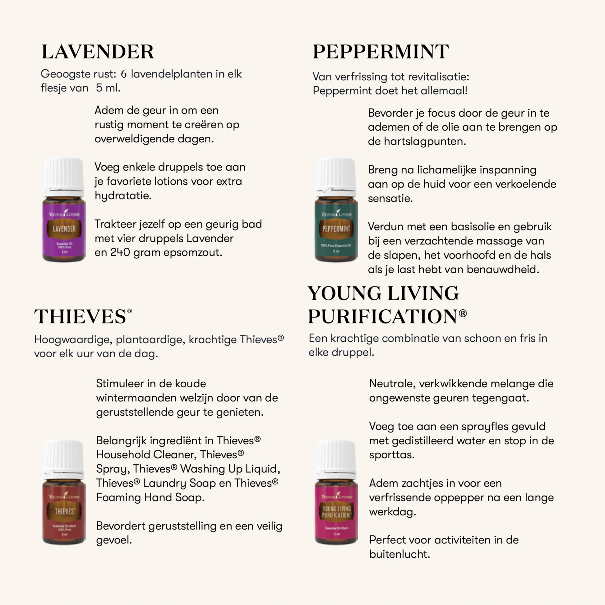 - 5 essentiële oliën van Young Living (Lavender, Peppermint, Thieves en Purification.)