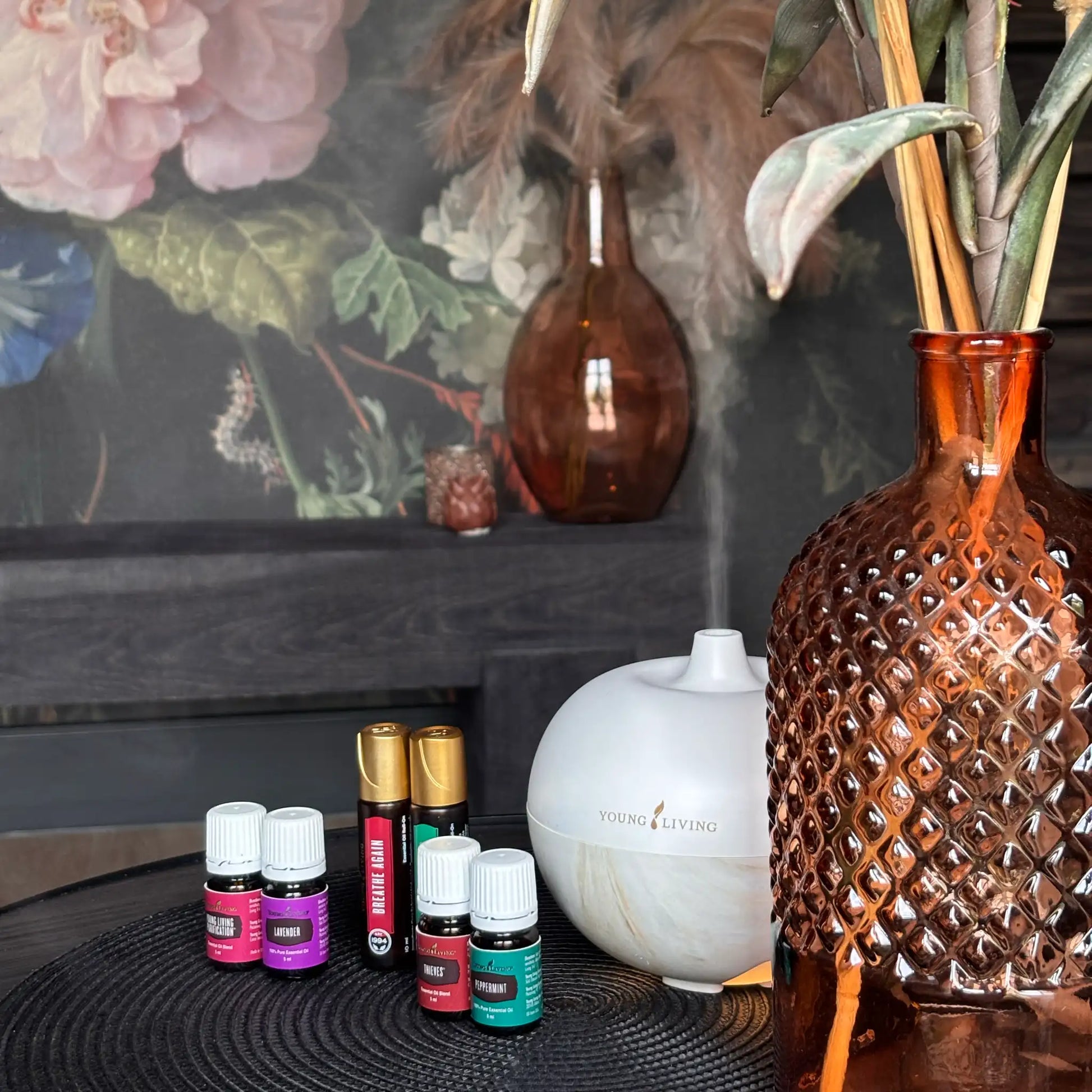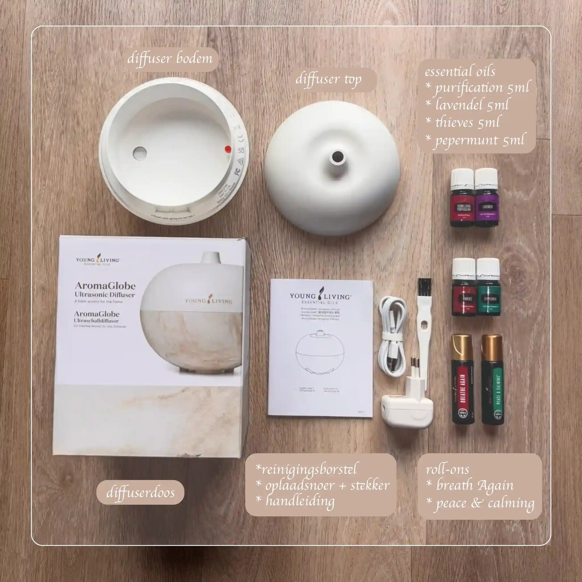 Je krijgt niet alleen een eenvoudige diffuser en toegankelijke oliën, maar ook duidelijke uitleg én praktische rollers die je meteen kunt gebruiken – zonder gedoe.